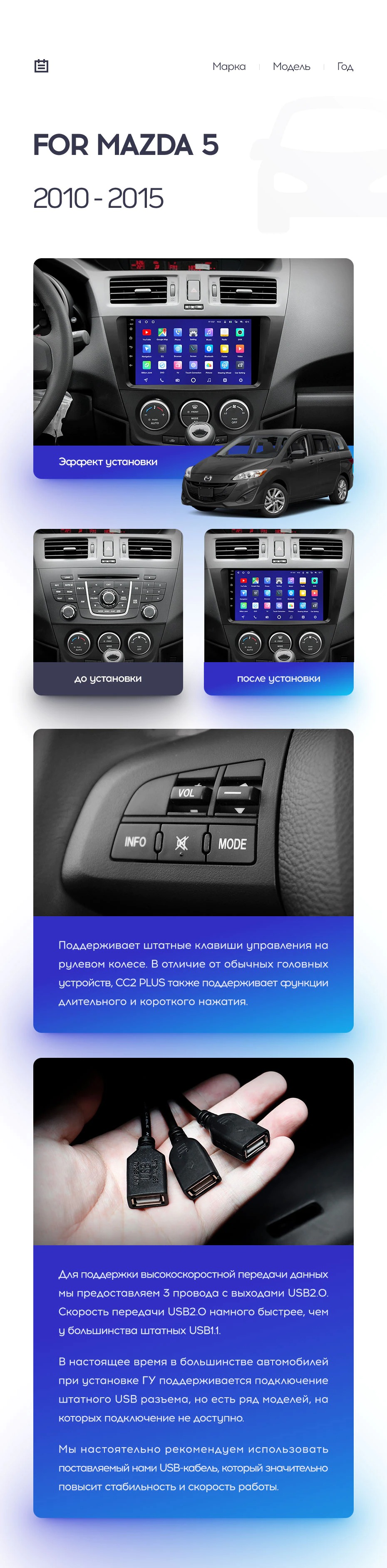 Полный комплект установки магнитолы Teyes с рамкой и проводкой можно выбрать в каталоге штатных магнитол Mazda 5 3 CW (2010-2015).