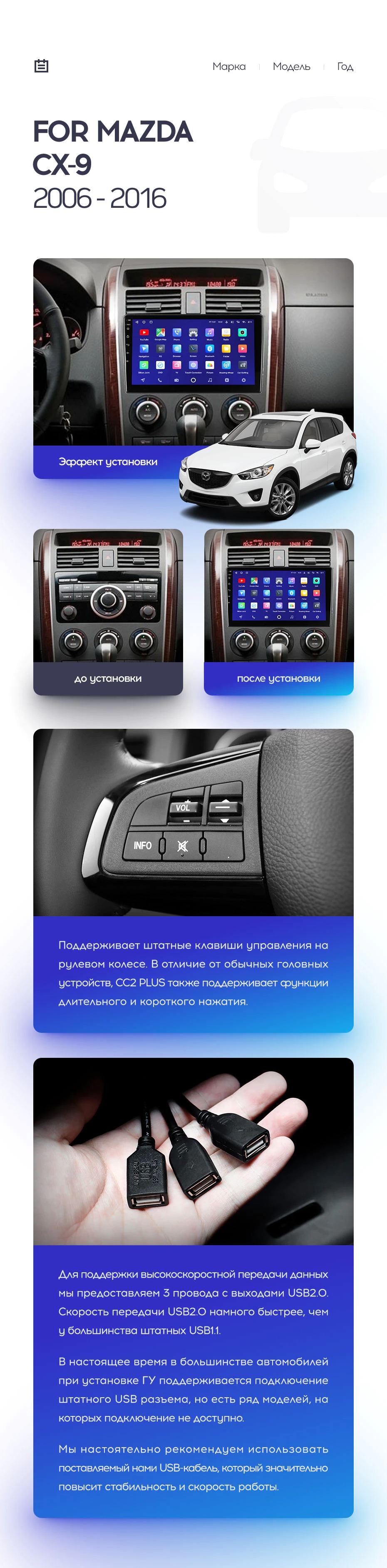 Полный комплект установки магнитолы Teyes с рамкой и проводкой можно выбрать в каталоге штатных магнитол Mazda CX-9 TB (2006-2016).
